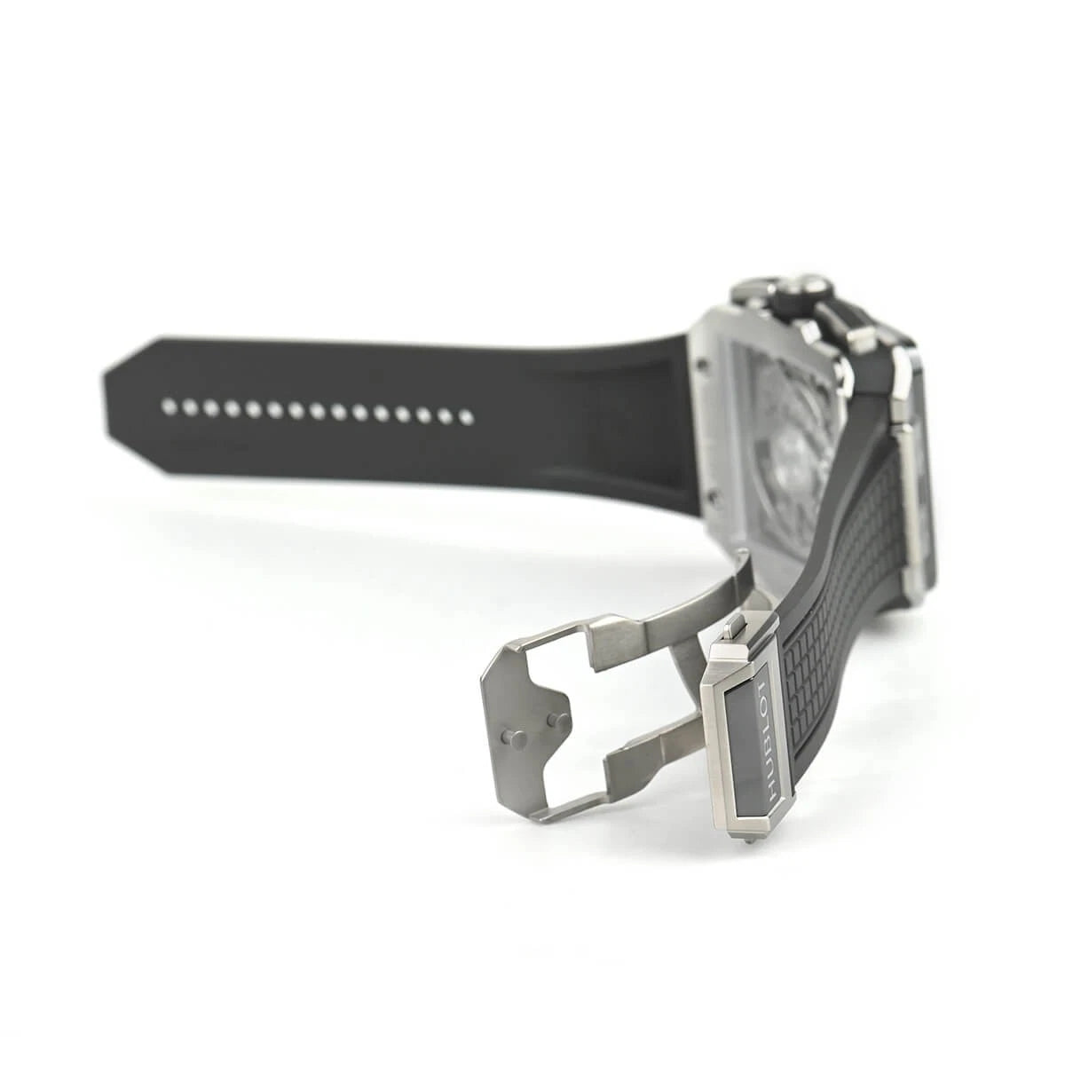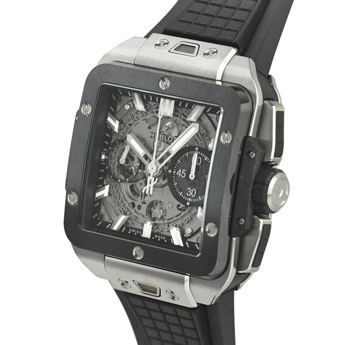 هاد الساعة عندها علبة مربّعة بقياس 42 مم مصنوعة من التيتانيوم عالية الجودة، والمينا شبه مكشوف باش تبان الداخل ديال الحركة الميكانيكية. الإطار من السيراميك الأسود كيزيدها لمسة راقية وكيحمي الساعة من الخدوش. الستيل والمعدن ديال التيتانيوم مع السيراميك كيعطيو توازن بين الخفة والمتانة