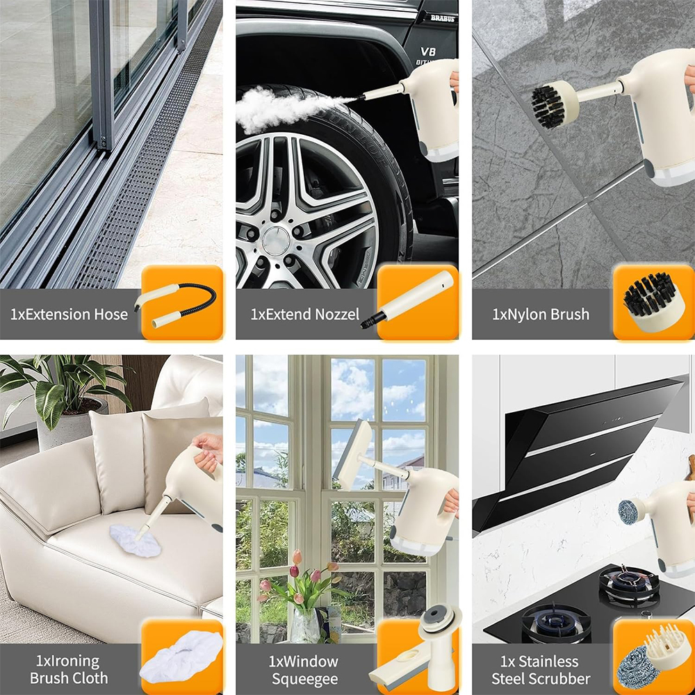 مزود بـ 5 رؤوس تنظيف متعددة تشمل: فوهة مستقيمة، فرشاة نيلون، فرشاة زجاج، فرشاة كيّ الملابس، وفرشاة من الصوف الصلب—مما يجعله مثاليًا للتنظيف العميق في المطبخ، الحمام، السيارة، الأثاث، الشبابيك، وغيرها